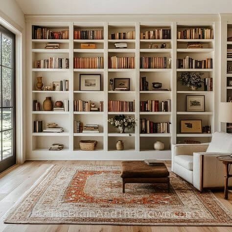If you’re not into the traditional floor-to-ceiling bookshelves with ladder look, here’s a clean example of a simple style I love with minimal detailing!
